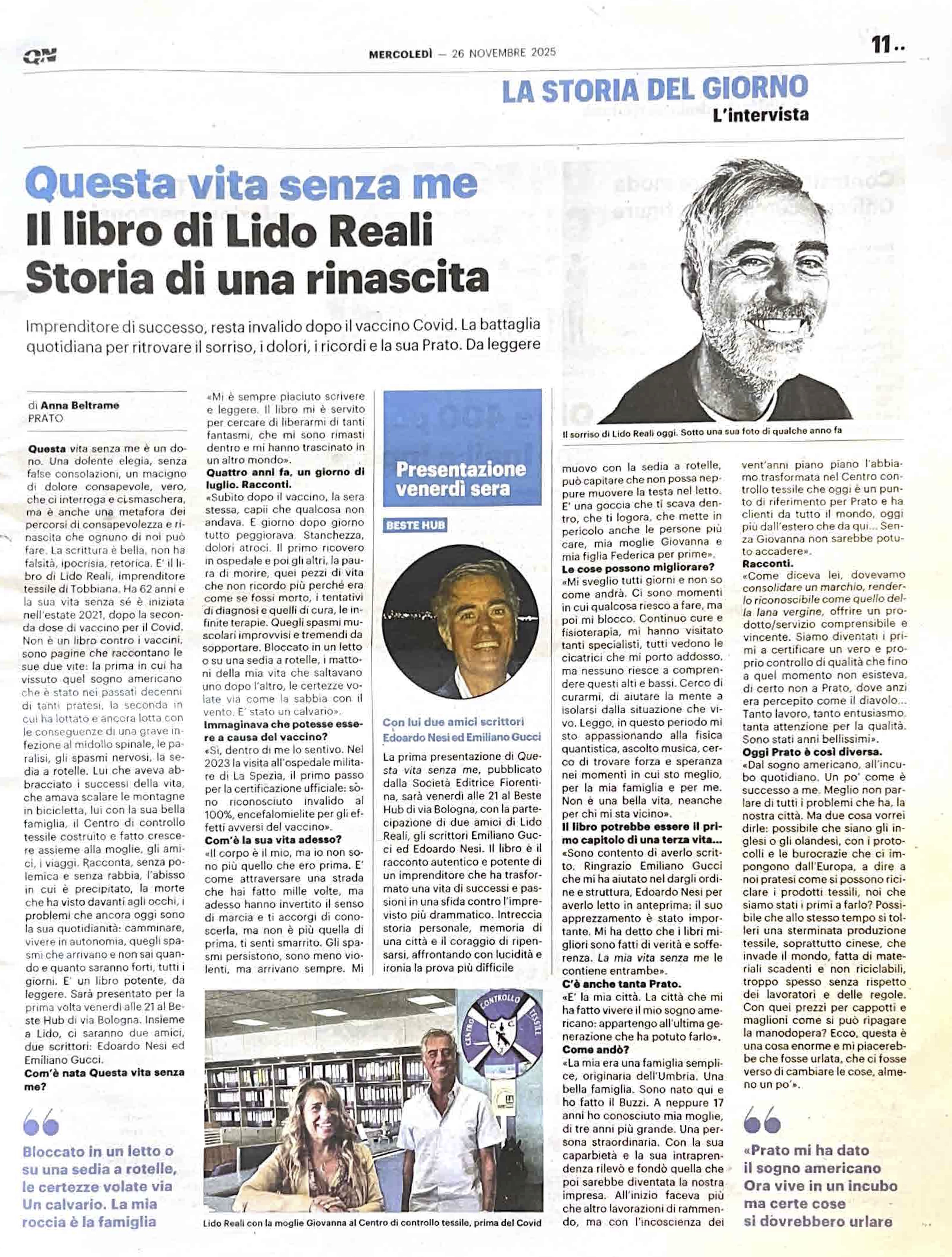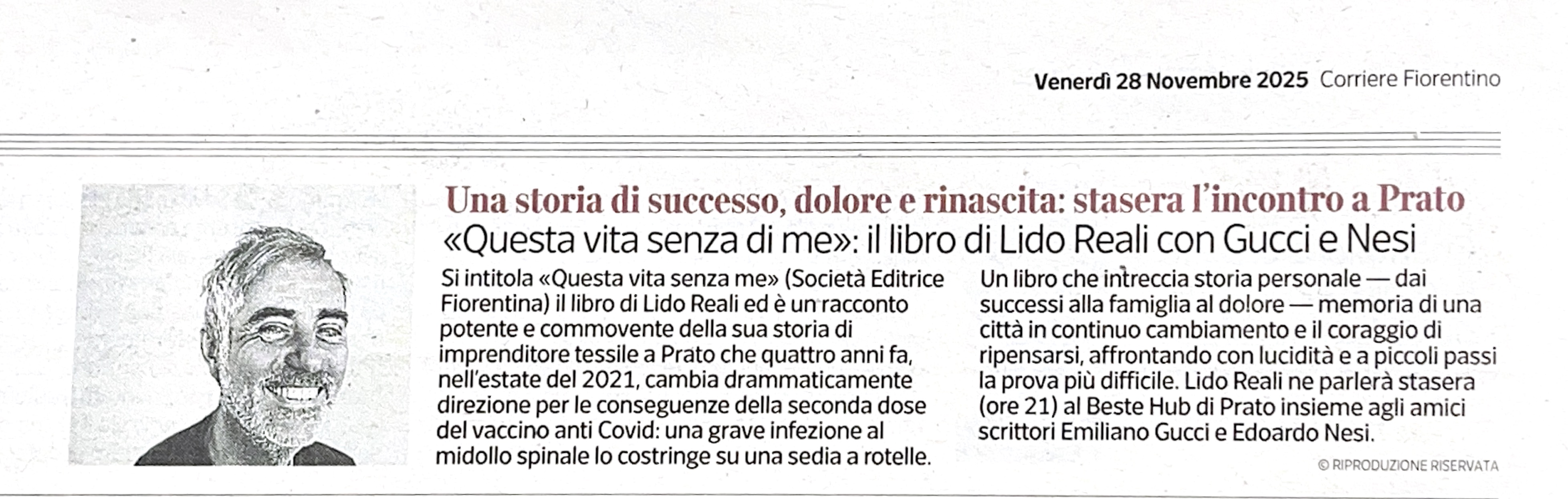 Lido Reali, imprenditore pratese, ripercorre il proprio percorso in un dialogo col lettore e con se stesso: come un ciclista arrivato in cima alla vetta, il suo sguardo si perde sui ricordi del proprio passato, sui dolori e sulle gioie che lo hanno attraversato. Il rapporto con la moglie Giovanna e con la figlia Federica, il successo di una carriera costruita con tenacia, la passione per la bicicletta, i contorni di una Prato intima e in continuo cambiamento: sono queste le tappe che segnano la grande corsa di Lido e che oggi lo portano alla sfida più difficile, quella della “malattia” che lo colpisce in un caldo pomeriggio di luglio.
